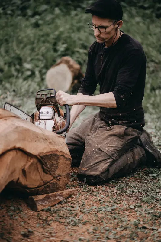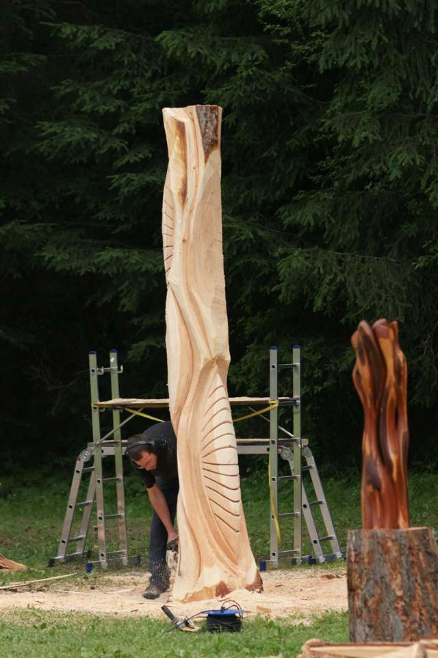 Der Arbeitsprozess meiner Skulpturen ist geprägt von der dynamischen anspruchsvollen Arbeit mit der Kettensäge, die mir ermöglicht, große Volumen und Formen zu erschaffen. Im weiteren Verlauf kommen Schleifgeräte und Schnitzeisen zum Einsatz, mit denen ich die Details bearbeite und die endgültige Struktur der Skulpturen herausarbeite. Jede meiner Holzskulpturen entsteht in mehreren Schritten, wobei der Dialog mit dem Material stets im Vordergrund steht.